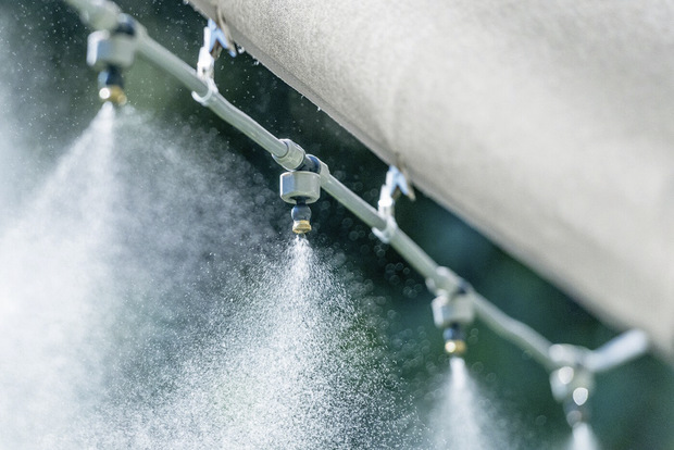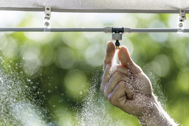 Die Düsen zerstäuben den Nebel, der die unmittelbare Umgebung abkühlt, und senken die Temperatur um bis zu 11 Grad.